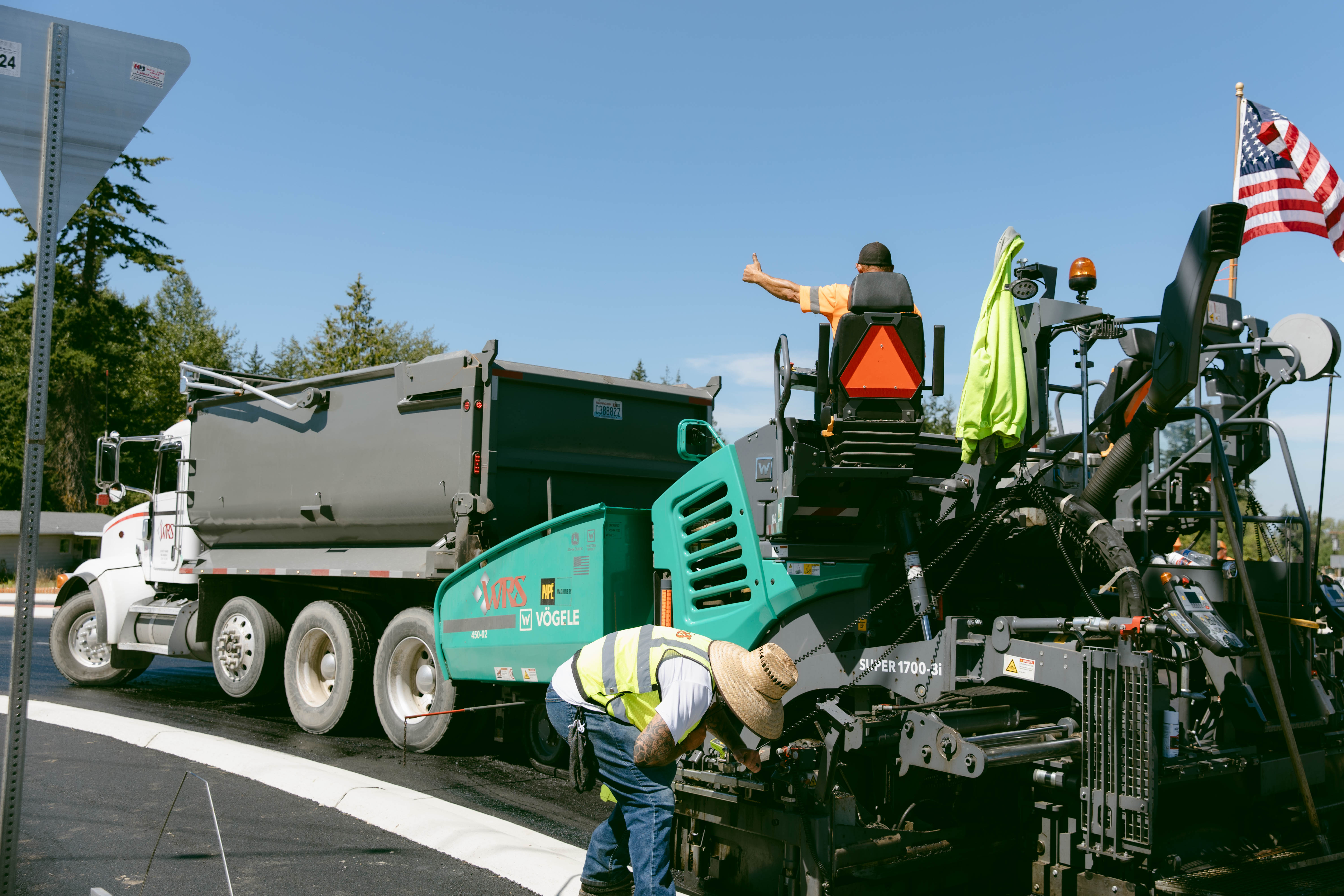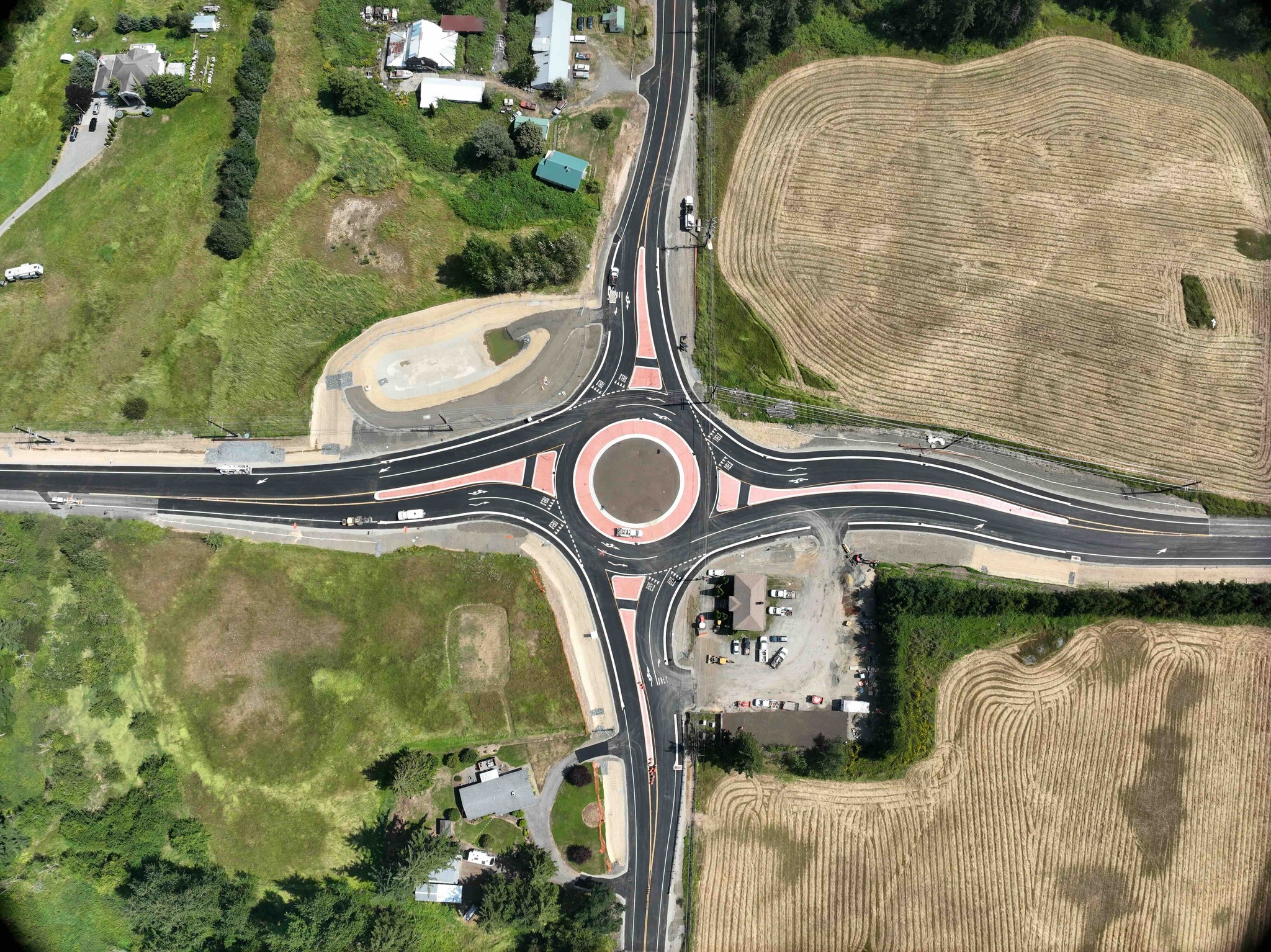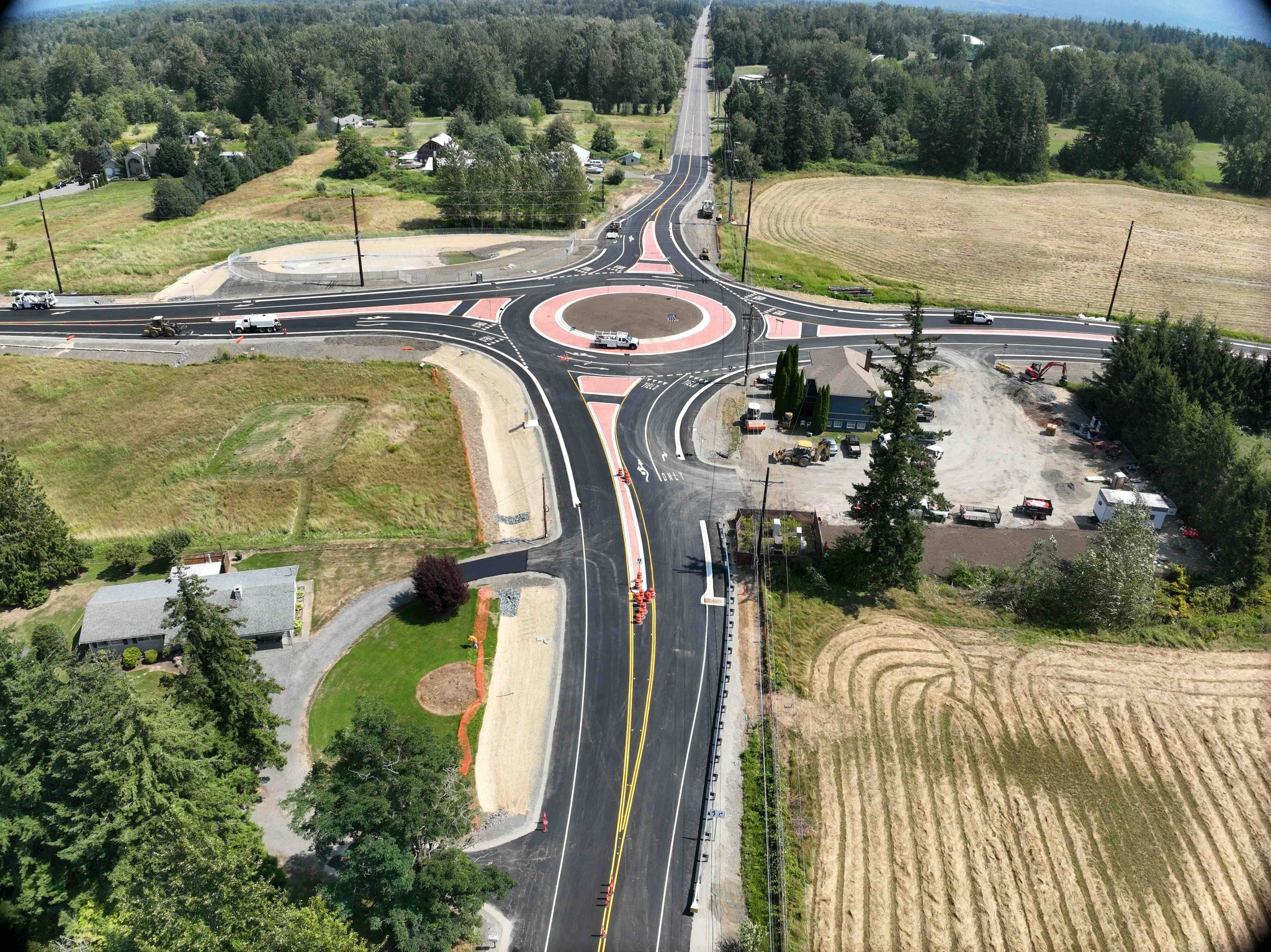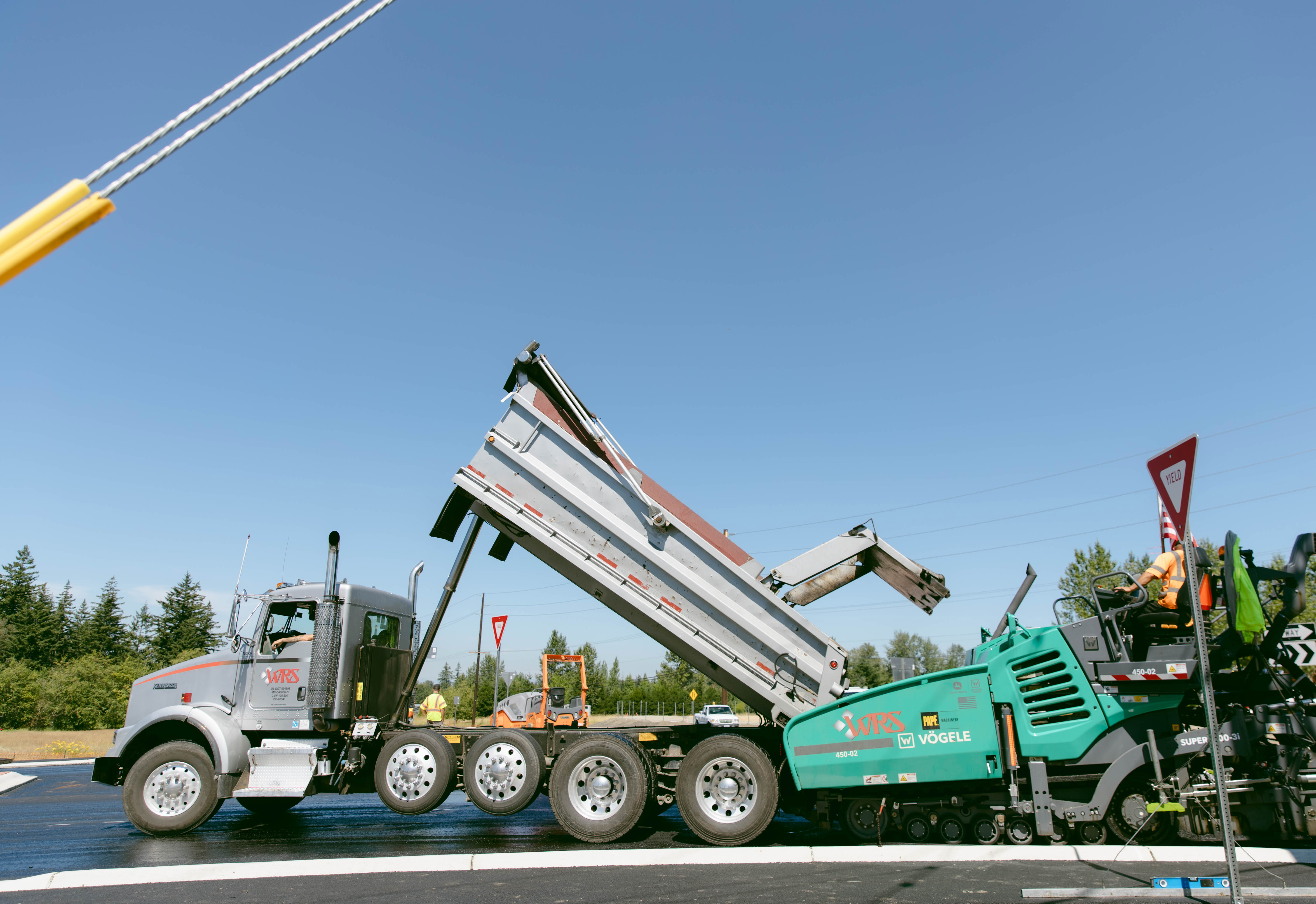 The E. Smith Rd. & Hannegan Rd. roundabout project in Bellingham, WA included laying 5,000 tons of asphalt over seven different shifts with the entire WRS asphalt paving crew in order to meet a tight timeline.